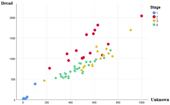 Based on the above stage division, we depicted the risk perception characteristics, as shown in Figure 6. During our sample period (71 days in total), there was a sudden increase and a gradual decrease in the level of public risk perception. The colors of the dots in Figure 6 represent risk perception at different stages. According to the distribution of risk perception characteristics, it can be seen that public’s dread and unknown about risk are high in the second stage (the red dots), while the third stage shows a decrease in dread, but the unknown is still high (the yellow dots). At the fourth stage, risk perception continues to remain high, similar to the third stage.