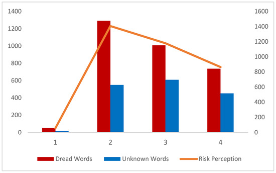Further, we characterized the performance of the “dread” and “unknown” dimensions of risk perception separately. As shown in Figure 4, the public expresses significantly more dread words than unknown words.