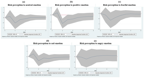 The main focus of the VAR model is the dynamic influence relationship between variables. The impulse response function measures the response of an endogenous variable to an error shock, revealing the dynamic changes in the interaction of variables over multiple time periods. We further analyzed the dynamic response process between public risk perception and emotion through the impulse response function. Figure 8 shows the impulse response function (IRF) results for different emotions on risk perception shocks, where the horizontal axis indicates the number of shock response periods and the vertical axis indicates the response of the dependent variable to the shock unit in the shock variable (i.e., the shock response function).
