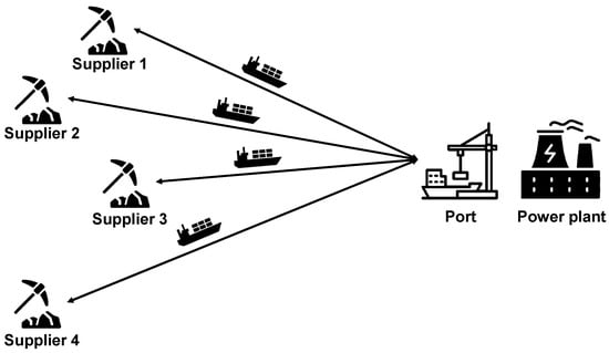 This system considers ESCM of supplier selection in emergency procurement under the uncertain situations, such as pandemics or wars. In emergency procurement, the buyer makes a short-term contract with the supplier according to market demand changes. This ESCM system consists of a thermal power plant and multiple suppliers that produce one type of fossil fuel such as coal, natural gas, or oil. Fossil fuels have different qualities because of the suppliers’ locations and production systems, and, therefore, the energy from each supplier has different calorific values. A thermal power plant uses various types of ships to transport fossil fuels. In addition, the thermal power plant, a buyer, has limited port capacity, limited budget, and carbon emission limitations. In terms of environmental sustainability, the thermal power plant considers carbon emissions during production and transportation from suppliers. Based on the above conditions, the thermal power plant must consider both the economic and environmental impact when ordering fossil fuels. In short, the thermal power plant attempts to select suppliers who supply high-quality fossil fuels with low carbon emissions. Figure 1 illustrates the study environment.