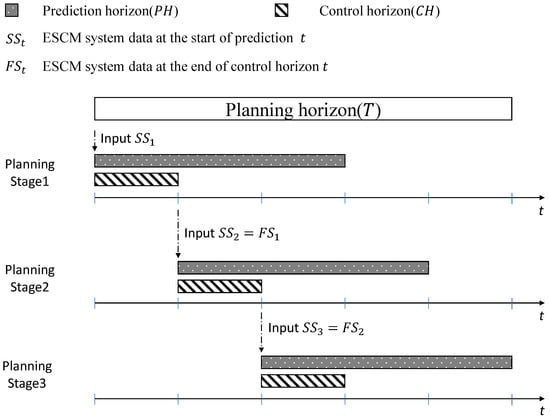 To handle the uncertainty of energy consumption, the information on market conditions has to be updated iteratively. The RHM solves mathematical programming models by dividing the entire time into smaller scheduling sub-horizons and repeatedly updating new information. The method is more efficient at planning and scheduling problems because it reduces the calculation time and, at the same time, updates information each period time rather than solving for the entire horizon. Yu and Yang [23] used the RHM to solve the crane scheduling problem of MILP in a hybrid storage container terminal. Li and Ierapetritou [24] proposed an RHM to address the integrated production planning and scheduling optimization problem. Silvente et al. [25] used an RHM that periodically updates input data information to solve MILP problems in ESCM for demand planning in microgrids. Even though the RHM does not guarantee an optimal solution, many researchers addressed the RHM for handling uncertainties.