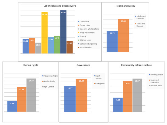 Finally, all social theme tables, indicators, and characterized issues are described in detail by Benoit-Norris et al. [54]. Social categories and impact categories in the SHDB provide relevant information so as to make the social sustainability concept commensurable in a supply chain context. The current analysis includes the disaggregated indicators provided by Benoit-Norris et al. [54] which are associated with the measurement of these categories; these indicators can be related to: