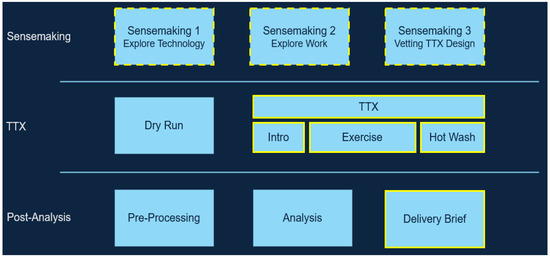 Caffrey [22] notes that the primary difference between a TTX and a wargame is that a wargame involves a thinking adversary, while a TTX can be played without one (the adversarial elements are typically developed and scripted prior to the TTX). For the sake of simplicity, we acknowledge this distinction, but use the term TTX throughout the remainder of this manuscript to be inclusive of both proper wargames and TTXs (a subset of wargames). TTXs have been historically used to develop and test military tactics [22] but have more recently been adapted for use in systems engineering contexts. For example, TTXs have been used to develop novel concepts for system employment [23], assess employment and adoption of novel technologies like unmanned systems [24,25], elicit requirements for user interfaces [26], and develop and refine measures of cyber resiliency to support test and evaluation activities [27]. TTXs are a mechanism to proactively expose a novel technology to an envisioned version of a future sociotechnical system, i.e., something advocated as being critical to better development and acquisition of intelligent systems [28,29].