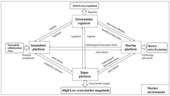Super platforms have already held a dominant market position in the initial business market, and they are further consolidating their position with the use of data and algorithms [59]. They are inclined to extend their advantages from the original market to new ones, by horizontal cross-border, vertical cross-border, and diversified cross-border strategies [4,60]. The platform ecosystem will then be strengthened. Therefore, cross-border expansion is a crucial requirement before double-round monopoly formation. The super platform makes differentiated investments in various target markets by thoroughly analyzing its resource advantages, cross-border challenges, and potential returns [61]. When a super platform enters a new market with its huge advantages in data, algorithms, traffic, and user scale, the incumbent platform in that market will face huge competitive pressure and urgently needs to adjust its strategy to cope with the super platform’s expansion trend. In terms of business sectors, the super platform and the incumbent platform might be rivals or allies [42], and their synergistic cooperation would indicate that benefits and hazards would co-exist [62]. The super platform and the incumbent platform will both experience larger innovation impacts and competitive pressure when the startup platform is able to amass users quickly and has the ability to infiltrate the super platform’s primary business sector [63]. Therefore, the super platform may engage in unfair competitive practices to block the entry of the startup platform [64]. The Chinese government promotes the inventive growth of startup platforms through innovation subsidies and other means, and uses them as a powerful tool to counterbalance super platforms and preserve a healthy level of competition in the platform economy market [65]. In order to prevent other market participants from losing their ability to compete effectively, government regulators must also regulate the super platforms promptly and effectively, but in practice, negative regulation and regulatory failure may still occur.