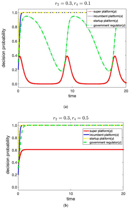 According to Proposition 3, as the probability of the incumbent platform choosing the synergistic cooperation strategy rises, the startup platform will switch to the strategy of market exclusion. Strong cooperation between the super platform and the incumbent platform will greatly raise the entry barrier for the startup platform and decrease its willingness to participate in competition. In contrast, the lower the probability of synergistic collaboration between the incumbent platform and the super platform, the greater the willingness of the startup platform to enter the market.