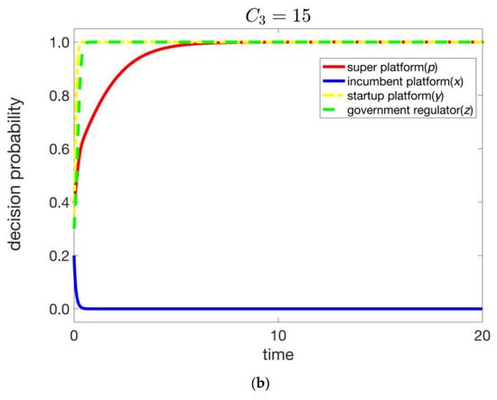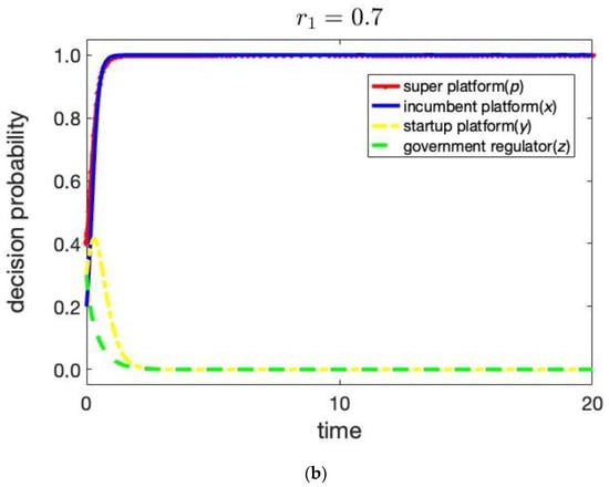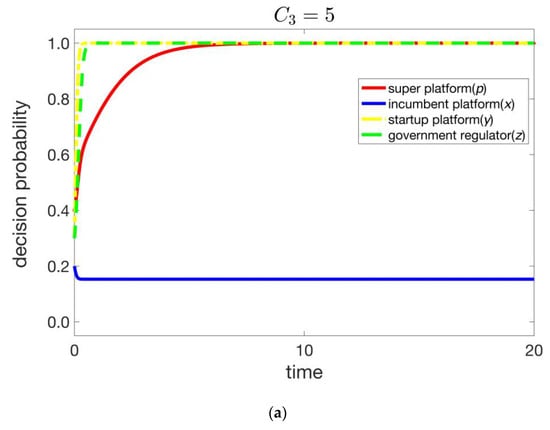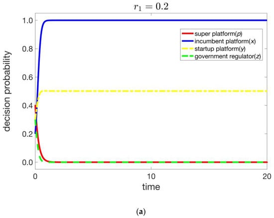 Thus, the startup platform’s decision depends not only on the costs and benefits of selecting various strategies, but also on the decision probability of the super platform, the incumbent platform, and the government regulator. According to the stability theorem of the differential equation, if the startup platform reaches a stable state, then: .