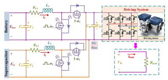 As shown in Figure 1, the fully active HESS’ topology consists of the battery, the SC, two bidirectional DC/DC converters, and the driving system (a DC/AC inverter and drive motor). The bidirectional DC/DC converter consists of two insulated gate bipolar transistors (IGBTs), an inductor, and a capacitor. For ease of control, the drive system is modeled as a load with variable current iload. In this paper, a variable current source is used to simulate it. The switches Q1, Q2, Q3, and Q4 of the IGBTs adopt the complementary PWM control method. When Q1 is on (off), Q2 is off (on), and Q3 and Q4 are the same. Based on Kirchhoff’s law and the state-space modeling techniques, the mathematical equations of the fully active HESS’ topology under ideal conditions are as follows: