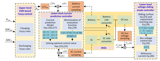 As shown in Figure 2, the proposed HCEMS-MPC strategy includes three parts: upper-level energy management based on fuzzy control, a lower-level current predictive controller, and a lower-level voltage sliding mode controller. This section first proposes an upper-level EMS based on fuzzy control which improves the service life of the HESS while dynamically adjusting the load power distribution and generating the current reference values. Then, a lower-level current prediction controller is proposed to predict the future state of the battery/SC current within a certain prediction range and to define the control variables and the evaluation functions for the predicted state, and the optimal control action is obtained. Finally, a lower-level voltage sliding mode controller is designed to stabilize the bus voltage of the HESS.