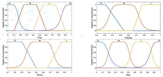 SOCsc: The actual domain of SOCsc is also [0, 1]. Considering that the discharge capacity of the SC is stronger than that of the battery and that it avoids complete discharge, the fuzzy domain of SOCsc is set to [0.1, 1].