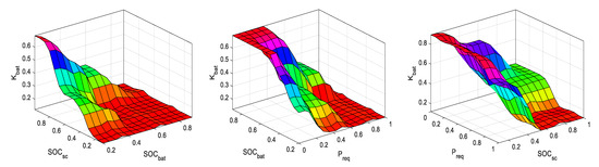 For the HESS, in addition to considering the high stability of the system, it is also necessary to make full use of the working characteristics of the battery and SC to dynamically adjust the distribution of the load power and to improve its service life, and this section proposes an EMS based on fuzzy control to achieve the above objectives. The required power Preq, the state of charge of the battery SOCbat, and the state of charge of the SC SOCsc are selected as the inputs of the fuzzy controller, and the battery power distribution coefficient Kbat is selected as the output of the fuzzy controller. Thus, the battery power Pbat and the SC power Psc can be obtained as follows: