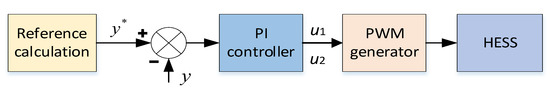 Based on Figure 1, Matlab/Simulink is used to construct a HESS simulation model. In order to verify the effectiveness of the proposed HCEMS-MPC strategy, compare it with the traditional PI control strategy and the composite nonlinear control (CNC) strategy. The adopted PI control strategy is shown in Figure 5. The difference between the reference value and the actual value is taken as the input of the PI controller, and the output of the PI controller is taken as the input of the PWM generator to adjust the IGBT switch duty cycle. The design process of the CNC strategy is given in reference [24]. Table 4 lists three simulation cases and their respective sections. The nominal voltage of the battery is set as 180 V, and the initial SOC is set as 100%. The initial voltage of the SC is set as 150 V, and the initial SOC is set as 100%. The DC bus voltage is set as 200 V. The frequency of the pulse width module is 10 kHz. In the current predictive controller, r1 = 0.5, and r2 = 0.5. In the voltage sliding mode controller, k = 3, and ε = 1. The other parameters of the HESS are given in Table 5.