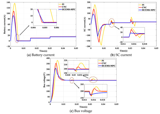 Considering the step change of the load power, the load power Preq is set as 0 W → 4000 W → 6000 W at the times 0 s, 0.015 s, and 0.03 s, respectively. Figure 6a shows the battery current response under the three control strategies. It can be seen that all three control strategies can maintain the stable output of the battery current; however, the PI control strategy has a large overshoot followed by the CNC strategy, and the proposed HCEMS-MPC strategy has the least overshoot. Nevertheless, the initial settling time controlled by the CNC is the smallest at about 0.00475 s followed by the proposed HCEMS-MPC strategy at about 0.0049 s, and the initial settlement time controlled by the PI control strategy is the longest at about 0.00575 s. Figure 6b shows the SC current responses under the three control strategies. It can be seen that when the power step changes, the proposed HCEMS-MPC strategy has a faster response speed and a smaller overshoot than the other two strategies. Figure 6c shows the DC bus voltage response under the three control strategies. It can be seen that when the power step changes, bus voltage fluctuation under the HCEMS-MPC strategy is the smallest, the adjustment time is shorter, and the steady state can be reached faster.