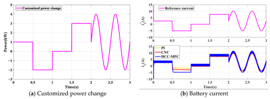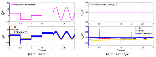 To verify the robustness of the HCEMS-MPC strategy, a sine wave with an amplitude of 3 kw and a frequency of 2 Hz is added between 2 s and 3 s to represent the load power ripple, which is combined with the square wave to form a customized power change as shown in Figure 7a. The battery current i1, SC current i2, and bus voltage Vdc are shown in Figure 7b–d, respectively. It can be seen that when the power fluctuates, both the PI control strategy and CNC strategy have certain errors, and the proposed HCEMS-MPC strategy has the smallest error in current/voltage tracking and can achieve the best control effect among the three strategies.