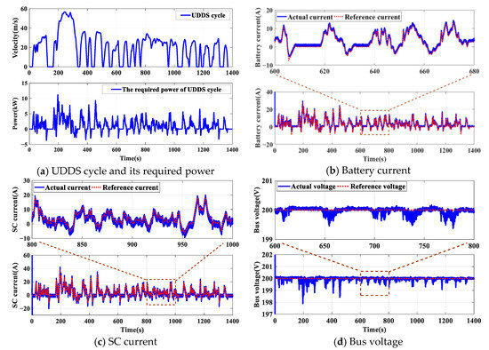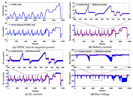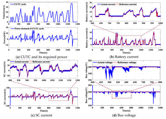 Figure 8a shows the UDDS and its required power. Figure 8b,c show the battery/SC current tracking curve of the UDDS. It can be seen that the battery/SC current can well track the reference value. Figure 8d shows the bus voltage changes. It can be seen that although the bus voltage fluctuates, it is still stable near 200 V, and the maximum error is only 2.1 V. Figure 9a shows the NEDC and its required power. Figure 9b,c show the battery/SC current tracking curve of the NEDC. Figure 9d shows the change in the bus voltage. It can be seen that when power fluctuation is large, the voltage will also fluctuate, but the maximum error is only 2.6 V. Figure 10a shows the CUTC and its required power. Figure 10b,c show the battery/SC current tracking curve of the CUTC. Figure 10d shows the change in the bus voltage, and the maximum error is 8.4 V. To sum up, under the three standard driving cycles, the proposed HCEMS-MPC strategy can achieve accurate power division when the required power changes, can stabilize the output voltage, and can quickly achieve the matching output of the reference current.