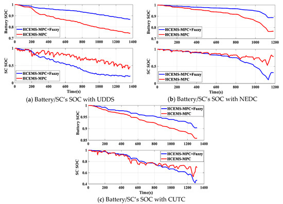 Figure 11a–c and Table 6 show the change in the SOC of the battery and the SOC of the SC before and after the fuzzy EMS is used on the three standard driving cycles (the UDDS, NEDC, and CUTC). After using the fuzzy EMS on the UDDS, the SOC of the battery increases from 0.744 to 0.869, and the SOC of the SC decreases from 0.463 to 0.212. After using the fuzzy EMS on the NEDC, the SOC of the battery increases from 0.766 to 0.887, and the SOC of the SC decreases from 0.784 to 0.317. After using the fuzzy EMS on the CUTC, the SOC of the battery increases from 0.858 to 0.903, and the SOC of the SC decreases from 0.692 to 0.467. It can be seen that the decreasing trend of the SOC of the battery is slower and that the final value significantly increases. The decreasing trend of the SOC of the SC is faster, and the final value significantly decreases, indicating that the SC has taken on more power. Due to factors such as the number of charging and discharging cycles and the degree of deep charging and discharging, which are closely related to the battery life, when the battery’s SOC is maintained at a high level, frequent deep discharging can be avoided, which is beneficial for reducing the battery aging rate and for extending the battery’s service life. At the same time, the slower decreasing trend of the battery’s SOC means that there is an increase in the single-discharge cycle time, which indirectly extends the battery’s service life. These all indicate that the HCEMS-MPC + fuzzy control is effective in extending the battery life.