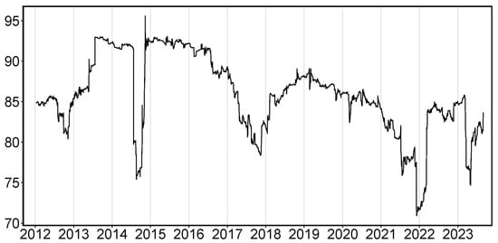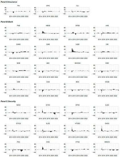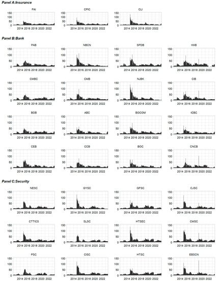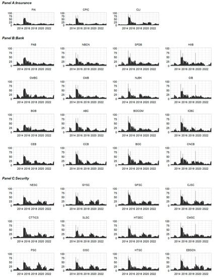 We analyzed the daily trading data of all publicly traded financial institutions listed in China’s A-share market before 2011, and the data were downloaded from Wind Info between 4 January 2011, and 31 August 2023, which covered the Chinese stock market crash in 2015. Hence, the sample includes 3 insurers, 16 banks, and 12 securities. Table 1 shows detailed information for each.