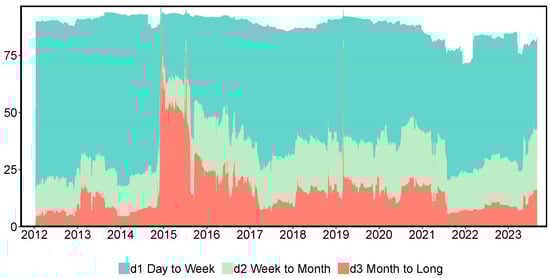 Figure 2 displays the frequency dynamics of the total connectedness based on time when looking at the frequency components. The decomposition provided the first observation that the periods with high total connectedness were mostly caused by the long-run components (d3). In particular, we noted that the long-run components in the 2015 cycle were much higher than those in the other cycles. Intuitively, the only systemic risk event during the sample period was the 2015 Chinese stock market crash. Another concern is that during the COVID-19 pandemic (2020–2021), although the total connectedness did not change significantly and may even be in a downward cycle, the long-term component increased, indicating that the risk of long-term association increased during this period. Connectedness typically arises during a crisis, implying that long-term connectedness carries a substantial risk of propagation, as rising stock market price volatility accompanies the overall high uncertainty regarding the financial system during these periods. Subsequently, more persistent investor responses to shocks are observed when uncertainty increases. Thus, when a financial system has high connectedness, long-term responses to shocks translate into long-term uncertainty, increasing systemic risk during these periods.