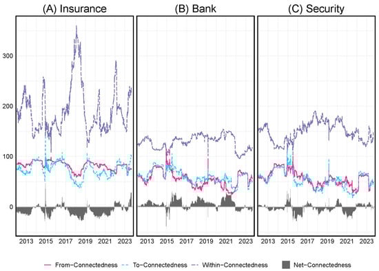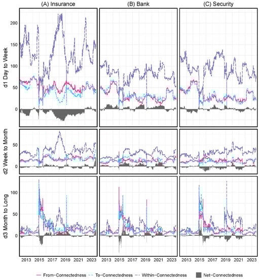Thus far, total connectedness and its frequency components have been the focus of our empirical research. Although Figure 1 and Figure 2 provide detailed information, sector-frequency connectedness provides more valuable results. Thus, we examine the time dynamics of connectedness in classified sectors, including insurance, banking, and securities.
