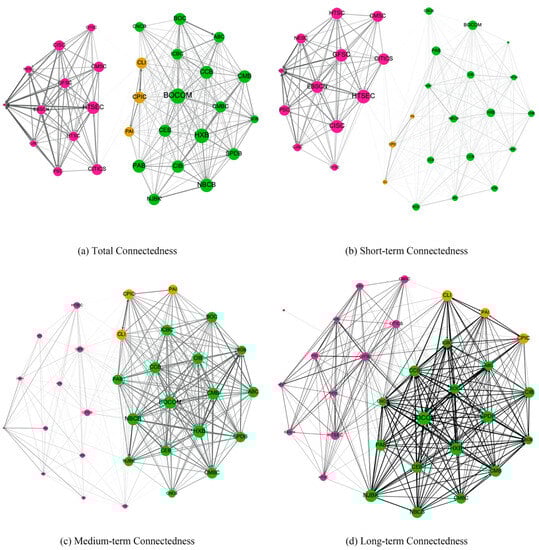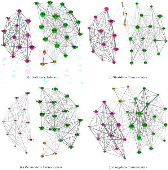 In this sub-section, an “average” network of institutions was predicted using the full sample period. Figure 8a shows the total connectedness of the network of the full sample of financial institutions. Figure 8b–d illustrate the full sample financial institution network’s short-, medium-, and long-term connectedness. Figure 8a shows that the institutions are split into three clusters, representing the three sectors. The connectedness across the three clusters is weak, as shown by the thin pairwise edges among the members of the three clusters. The results in Figure 8b–d are valid for the short-, medium-, and long-term connectedness networks, indicating that the three clusters have weak links.