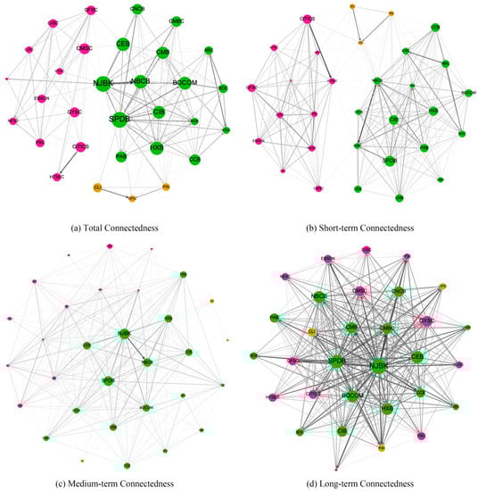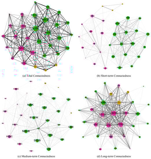 Figure 10 shows the total (frequency) connectedness network during the 2015 Chinese stock market crash (30 June 2015). Similar to Figure 8, Figure 10a–c represent the clusters of the three sectors with weak links. However, the to-connectedness of the securities and insurance sectors (node size) is smaller than that of the banking sector, indicating that securities were not risk emitters during the crash. In the long-term connectedness network in Figure 10d, the connectedness structure turns into a core–periphery structure. However, the core institutions included several banks, such as NJBK, SPDB, and CMBC, instead of securities, indicating that banks were the main risk transmitters during the crash. Worth noting is that the risk contributions of the five institutions listed in the G-SIB and G-SII lists (i.e., ICBC, BOC, CCB, ABC, and PAI) were small. One possible reason is that these systemically important institutions are well regulated. Figure 11 shows the total (frequency) connectedness network during the post-crash period, which is similar to Figure 8 and indicates the normal state.