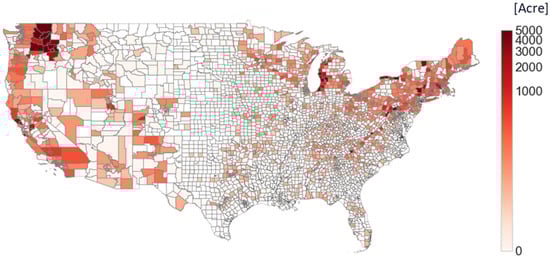 The U.S. is selected as a case study region (country) because its continental area is wide; thus, it is suitable for observing spatial changes in apple cultivation depending on the temperature variations triggered by climate change. The production volume and economic value of the apple industry in the U.S. are also high enough for a case study. The U.S. produced 10.1 billion pounds of apple, representing the second largest yield and over 5% of the global production, in 2022, and the revenues from over 26,000 producers were around 3.2 billion U.S. dollars [,].