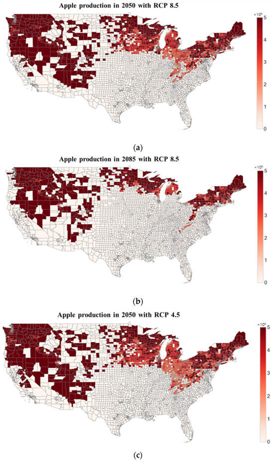 Figure 3 depicts the counties expected to produce apples in 2050 and 2085 across three distinct RCP scenarios. Darker red shades mark counties with a higher projected apple production, while lighter hues indicate reduced apple yields. The variations in the apple production map are subtle in the RCP 2.6 scenario, attributed to the consistent 0.5 °C temperature increments anticipated each year. This level of accrual does not impact apple production regions. However, the RCP 4.5 and RCP 8.5 scenarios forecast more pronounced changes in apple yields. For instance, in RCP 4.5, the Midwest regions, including states like Illinois and Indiana, may see reduced apple production, whereas the Northeast remains relatively stable. The RCP 8.5 scenario predicts even more striking shifts, largely due to minimal efforts in carbon emission reduction, leading to higher temperature rises. For this reason, a remarkable number of areas are projected to be lost from the apple-producible counties in 2085, although they are marked as producible counties in 2050. This trend indicates that if we do not make efforts to curb carbon emissions, as the RCP 8.5 scenario shows, the producible apple areas in the U.S. will be discernably reduced.