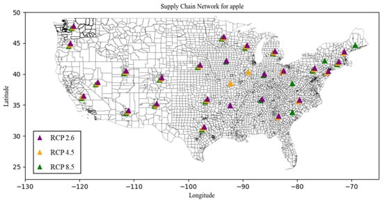 Third, while the model’s case study in this research focuses on the U.S. domestic apple industry, the geographical applicability of the model is not confined solely to the U.S. Since the proposed model has demonstrated resilience in maintaining operational efficiencies under variated input conditions, its applicability can be expanded to other geographical regions even in the global perspective. Since apple is produced in more than 125 countries and traded internationally [], the model may be applied to find the optimal supply chain network, in terms of facility locations and trading routes, upon obtaining the temperature and demand projection data of each country. However, as Davis et al. pointed out in their study, the global supply chain is dynamically shifting under the current climate change and thus observing the real-time change of the supply chain is also valuable to study []. From this perspective, the mathematical model proposed in this research has limitations because it suggests the optimal solution after considering all changes occurring within a specific time frame. A simulation methodology, such as agent-based modeling, would be an alternative approach to capture the real-time dynamics of the supply chain and consequent decisions of each agent belonging in the system, which will be a future research direction.