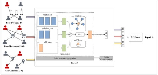 The model of this paper is shown in Figure 2. We construct the Tri-RGCN-XGBoost model which mainly consists of two parts: the first part is Tri-RGCN and the second part is the XGBoost layer. RGCN (relational GCN) is a model evolved based on a graph convolutional neural network to solve the heterogeneous graph problem, which is based on the aggregation of neighboring nodes from the local structure, and the encoded features are very effective for the task of supervised node classification. The Tri-RGCN layer uses three independent RGCN models to achieve the classification task and outputs the classification results of the three classes of relational graphs.