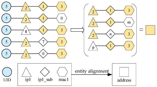 To ensure that the relational network is accurately connected and to avoid excessive network sparsity, the two types of nodes, address and device, were compressed by defining the entity alignment means, which in return, realizes the compression of the number of nodes. In the case of address nodes, the specific entity alignment means are shown in Figure 3. The address entity corresponding to ip1, ip1_sub, and mac1 were regarded as entities independent of each other for encoding, and multiple relationships can be obtained based on the original data; for the same user, when more than two address entities are the same, the combination of the address entity is considered to represent the same address. The new address entity is re-encoded and the operation is repeated to compress the device entity node to obtain the user transaction heterogeneous graph.