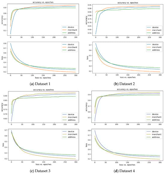 The bipartite graphs GUD, GUM, and GUA correspond to three association situations, i.e., three behavioral patterns for user–device, user–merchant, and user–address interactions, respectively. In order to study the optimization process of the Tri-RGCN layer and the fraud detection effect of each behavioral pattern, the bipartite graph performance of the RGCN layer was compared and analyzed. The change in accuracy and loss during the RGCN optimization process on datasets 1–4 is shown in Figure 5.