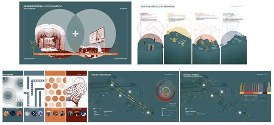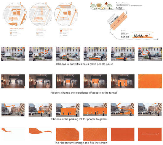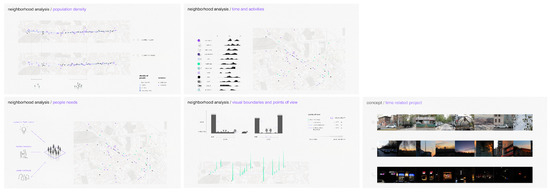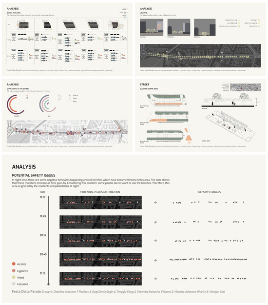 The student’s engagement in the process can be described as twofold: that of futures researcher, gathering detailed narratives from citizens, and that of translator or mediator, interpreting their thoughts and concerns into experiential scenarios so that they can be more easily seen, heard, and told (An example of students’ work on analyzing the social environments by considering time-based and human-centered approaches, see Figure 6). The first stage brings futures to light; the next brings them to life [44]. This two-stage approach serves to bring futures to the forefront of awareness and subsequently breathe life into them. It is noteworthy that the Space Design Lab does not view design as an ultimate endpoint; the output of design is not the end in itself, but rather it is used as a means to discover, suggest, and provoke [33]. Design functions as a catalyst for futures, while futures reciprocally support design through various forms of activism, exhibitions, kits, chronotopes, maps, and diagrams.