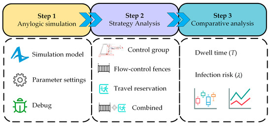 In summary, from the perspective of metro passenger flow control strategies, current research mainly includes flow-control fences and travel reservations. However, from the perspective of our research objectives, most of them focus on alleviating traffic congestion, with only a small portion considering reducing the passenger infection risk, and without quantification [13,33]. Therefore, this study addresses the challenging problem of increasing passengers’ travel efficiency while lowering the COVID-19 transmission risk at the metro station. In light of the upcoming analysis, this study selects Xiaozhai metro station as a case study. This study conducts simulations of the Xiaozhai metro station operations under three distinct flow restriction strategies: flow-control fences, travel reservations, and the combined strategy. Additionally, this study develops an infection risk assessment model for passengers under these three flow restriction strategies. The simulation model is developed in the Anylogic software platform, which is widely used for such agent-based simulations [38,39,40]. Ultimately, a comparative analysis is undertaken, contrasting the outcomes with scenarios devoid of any flow restriction strategies to elucidate the risk reduction efficacy associated with flow restrictions in the context of travel reservations.