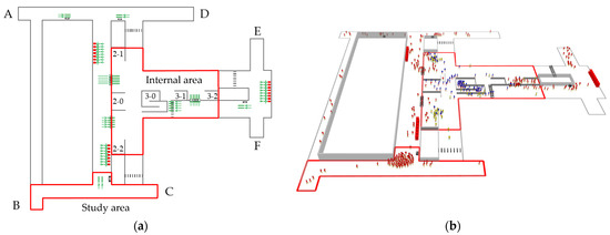 Situated in Xi’an, China, the Xiaozhai metro station serves as a nexus for line 2 and line 3 [42], and its use has exhibited a pronounced rise amidst the prevailing COVID-19 pandemic containment policies in China. During peak periods, an inundation of passengers descends upon the station in a brief span, surpassing the station’s nominal capacity and creating recurrent gridlock. Passengers frequently find themselves forced to endure extended waits outside the station, thereby engendering diminished travel efficiency and an elevated susceptibility to infection. Therefore, this study selects Xiaozhai metro station as its research object. The spatial arrangement of Xiaozhai station’s concourse level is visually depicted in Figure 2. Here, A, B, C, D, E, and F represent the entrances/exits of the subway station. passengers pass security checks and buy tickets to enter the station through the gate, while 2-0, 2-1, 2-2, 3-0, 3-1, and 3-2 indicate the locations of escalators, as shown in Figure 2a; passengers may access and leave line 2 by means of the escalators denoted as 2-0, 2-1, and 2-2. Likewise, line 3 can be accessed via escalators 3-1 and 3-2. It is worth noting that escalator 3-0 exclusively functions as an egress point for passengers departing from line 3. Additionally, it is possible to effectuate transfers between line 2 and line 3. Red, yellow, blue, and green agents, respectively, represent passengers entering, leaving, transferring, and making reservations to enter the station, as shown in Figure 2b.