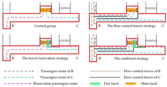 Drawing upon the modeling principles and pertinent data outlined earlier, we conducted a simulation of passenger flow organization at Xiaozhai metro station using Anylogic software. The simulation replicated the station’s operations over a period of 600 s. As shown in Figure 2b, congestion occurs at the BC entrance of Xiaozhai metro station, and no abnormalities are seen in other areas. Therefore, we selected the BC inlet area for the study, as shown in the Figure 2a study area. Furthermore, we have also gathered pertinent metrics pertaining to the internal area in order to investigate the potential occurrence of internal congestion resulting from varying passenger flow control strategies. Different flow-control strategies are proposed for the congestion in the study area, as shown in Figure 3:
