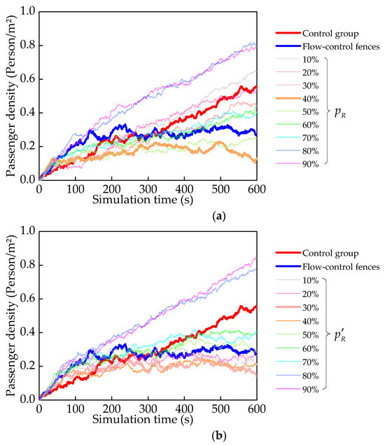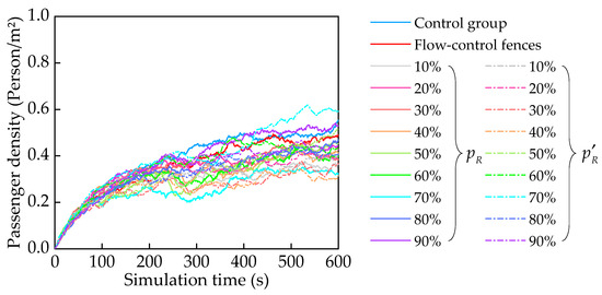 The figure denoted as Figure 4 illustrates the passenger density pertaining to the different strategies implemented for controlling passenger flow. The conducted investigation reveals that within the control group, the initial occurrence of congestion transpired approximately 140 s into the simulation and lasted for a duration of 50 s. Subsequently, the second congestion episode emerged around the 300 s mark and persisted until the conclusion of the simulation. On the other hand, when employing flow-control fences as a means to regulate passenger flow, a reduction in passenger density was not observed until 300 s had elapsed. This divergence can be attributed to the fact that, during the initial 300 s, there was no significant concentration of passenger flow, and the utilization of directional fences led to an increase in the walking distance for passengers. Such an arrangement was not conducive to diminishing the density of the passenger flow. When using reservation travel methods for traffic restriction, when the reservation proportion is between 30~70%, the passenger density is lower than that of the control group. But this does not necessarily mean that it effectively controls the passenger flow. Based on Figure 4b, it is evident that when the proportion of reservations is between 10~30%, the addition of flow-control fences impedes the gradual rise in passenger density in the main track, compensating for the low utilization of the fast track and, consequently, mitigating congestion in the main track.