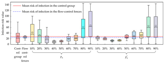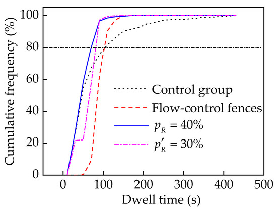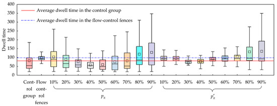 When travel reservations are employed in conjunction with flow-control fences, they effectively alleviate the obstruction of the original passage. This observation aligns harmoniously with the findings presented by Patel in the literature [31]. However, in this study, it is imperative to exercise judicious control over the proportion of reservations, maintaining them within the range of 30~40%. This not only reduces the risk of infection but also enhances travel efficiency. However, when the reservation proportion surpasses 50%, the main track is no longer obstructed. Employing flow-control fences in this scenario would counterproductively prolong the duration of passenger dwell times and increase the risk of infection for passengers.