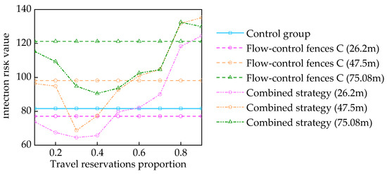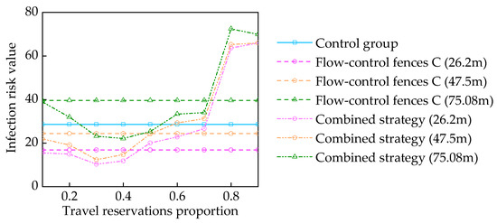 Next, the influence of the flow-control fences’ length on various parameters was analyzed. As shown in Figure 9 and Figure 10, maintaining the length of the flow-control fences B while decreasing the length of the flow-control fences C to 26.2 m results in a concomitant reduction in both the risk of passenger infection and the average dwell time. The effect is more pronounced alongside a reservation proportion between 30% and 40%, with 30% emerging as the most favorable option, improving travel efficiency by 20.98% and reducing the infection risk by 63.97%, as shown in Table 6. In comparison to the travel reservation strategy (Table 5), a superior performance is evident across the reservation proportions ranging from 10% to 30%.