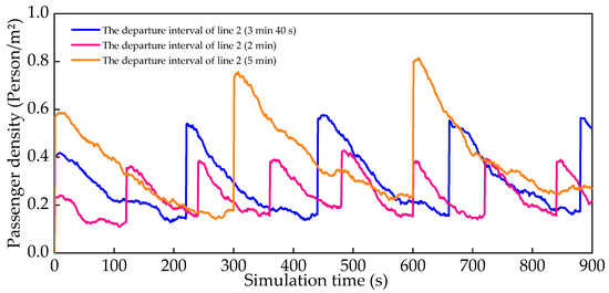 Passenger density in internal area under different departure intervals of line 2.