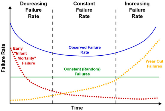 The Bathtub curve is a basic expression in reliability theory because it expresses the probability that a component will remain in a fault-free state even after a specified time. Based on this, it is possible to estimate the availability of components and perform a reliability analysis. However, as for the reliability model of repairable components, its formulation becomes difficult because not only the curve of the tub is required, but also the speed of repair [61]. The process described in this way, which is based on a statistical expression, can be assessed theoretically using a simple predictive curve model [62,63]. As a final note regarding the Bathtub curve, it is important to notice that the curve for an actual product may look very different from the one shown in the figure. For example, there may be very few early failures, or the failures due to wear may start very early and happen slowly, causing the curve to increase slowly already during the useful lifetime. There are endless possibilities, but the simple Bathtub curve is still a good tool to describe typical failure rate behavior.