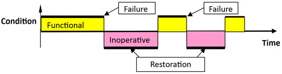 To achieve the required level of reliability, we use reliability analyses. These reliability analyses are used to assess a system’s reliability. To achieve the desired level of reliability, separate steps involving design modification, iteration, and optimization are undertaken. Different qualitative and quantitative methods are used, employing mathematical modeling and appropriate simulations [8]. Reliability analyses are carried out at the stages of conceptualization and requirement setting, design and development, production, use, and disposal. They are also applicable at the stages of operation and maintenance, primarily for the evaluation and determination of reliability indicators and to assess the fulfilment of the specified requirements. This means that such analyses are relevant at all stages of a product’s life cycle. System reliability analysis is a process whose essence is the acquisition, examination, and arrangement of significant information for the given system and necessary for making decisions according to the specified goals [9,10]. Research usually takes place using system models. The final product of this process is a set of information concerning the properties of the system model [11]. The model can be modified during the analysis. The analysis must be performed according to clearly defined rules and procedures, so that the analysis process is repeatable and always leads to the same results [12,13].