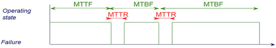 - Kullstam, P.A. Availability, MTBF and MTTR for repairable M out of N system. IEEE Trans. Reliab. 1981, 30, 393–394. [Google Scholar] [CrossRef]