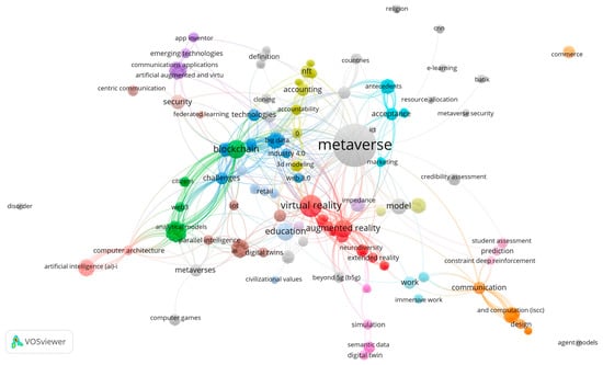 The search for “metavers*” produced 1717 results, including 1208 articles, 343 proceeding papers, 138 review articles, and 32 book chapters, gathering 444 keywords organized in 14 clusters (Figure 1).