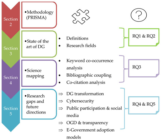 Many recently published studies have discussed DG. Some reviews examined local governments in specific regions or countries [9,10]. Others studied the DG architecture by examining the challenges and problems in investigating the research agenda [11,12,13]. Other review papers focused on knowledge management in the public sector and open government data (OGD) [14,15]. None of these studies about DG so far have applied science mapping to capture the literature by examining their key terms. Science mapping applies visualization methods to ensure a novel approach to dynamically discover new frontiers [16].
