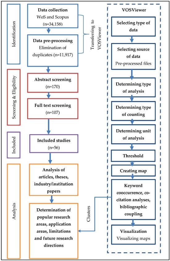 This study presents a systematic review using PRISMA (preferred reporting items for systematic reviews and meta-analyses) guidelines for searching activities, as illustrated in Figure 2 [18]. At the very start, we collected data from the WoS and Scopus databases, the details of which are provided in Section 2.1. Then, we pre-processed the data to remove duplications.