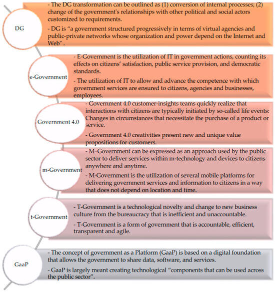 The terminology of DG is divided into six concepts: “digital government”, “e-Government”, “government 4.0”, “mobile government”, “t-Government”, and “GaaP”. These concepts have distinguishing features; however, they can be used interchangeably with each other.