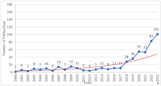 The number of publications published 2000–2023 (Source: Scopus, November 2023). * This number indicates the publications until November 2023.