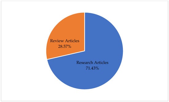 The selected 56 articles were examined according to year, author(s), article type, system, applied methods, technology, and country, as shown in Appendix A, Table A1. Our examination by article type aimed to distinguish research articles from review articles. As seen in Figure 5, 71.43% of the examined documents were research articles, while 28.57% were review articles. The applied methods were examined to find the literature gaps from an analytical perspective. Technologies and countries were examined to see which country was studied for which technology in the related literature.
