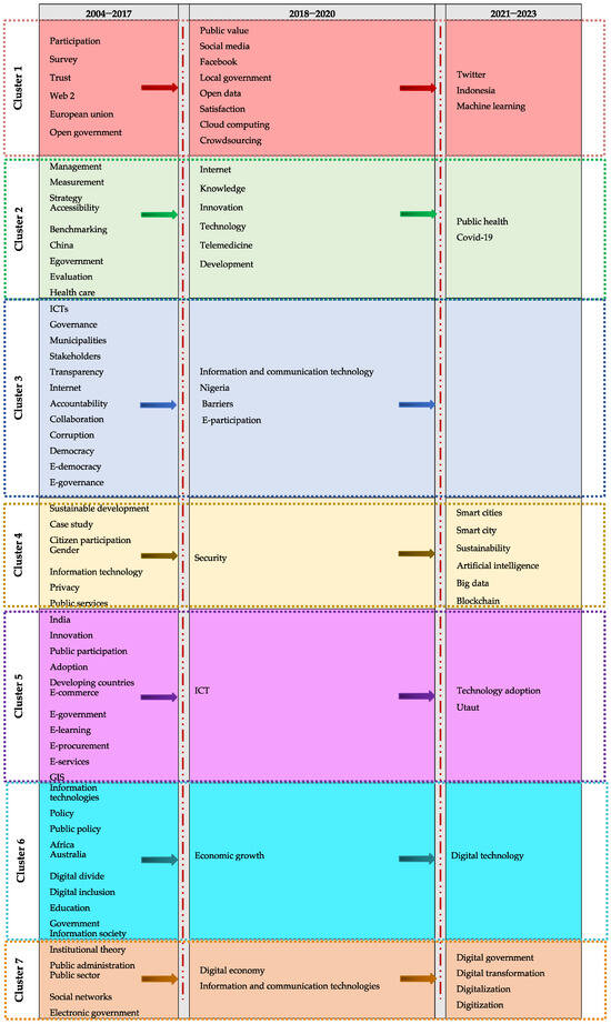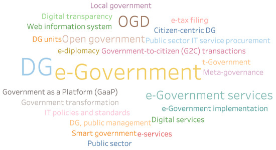 “Digital government”, “digital transformation” and “digitalization” were the most frequently studied keywords from cluster 7. Other key research topics from clusters 4, 6, and 7 involved “government”, “smart city”, and “smart cities”. Furthermore, “sustainability”, “sustainable development”, “security” “digital divide”, and “education” concepts have also been frequently studied in the DG literature. In the acceleration of DG transformation, data exchanges across the “public sector” should be expanded by technologies to construct an integrated and sustainable system [29]. The most promising “digital technologies” for governments were found as “artificial intelligence”, “blockchain”, and “big data”.