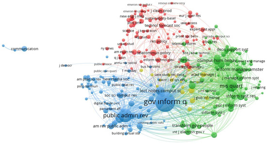 In this analysis, the counting method was selected as full counting, the unit of analysis was selected as cited sources, the minimum number of citations of a source was selected as 50, and 263 sources met the threshold. Figure 10 displays the document co-citation analysis regarding sources. Figure 10 illustrates the clusters’ colors that indicate the similar types of journals having common co-citation links.