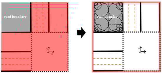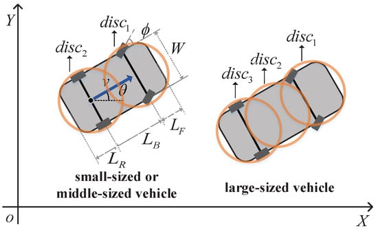 Figure 3a becomes a challenge. This results in a constraint that is markedly nonlinear and lacks differentiability. To address this, the quandary is reshaped into a more manageable model by employing circular structures, or discs, to simplify the rectangular vehicle’s shape (as seen in